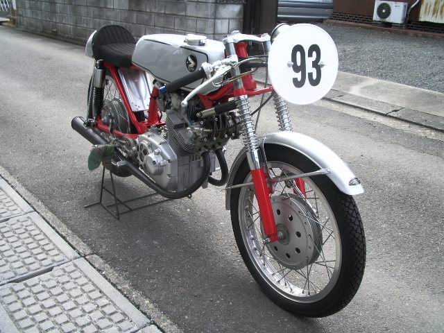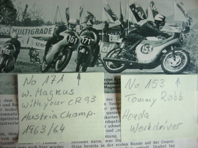 日本語 English ![]() 里帰りしたCR93(CR93 History) Honda CR93 Benly レーシングは1962年9月、鈴鹿サーキットの完成と第一回日本グランプリーに 合わせ、またその3ケ月前にCR110と同時に発売された市販レーサーである。 このCR93はGPマシン並みの高性能でクラブマン向けに生産され,1962年イギリスのマン島TTレースで2台の RC145に次いでワークスマシンを尻目に堂々の3位入賞を果たした実績を残している。 このCR93は125ccでありながら、DOHC 2気筒で21.5ps、13500rpm、5速ミッションを持ち最高速135km/hを マークした。 1962年6月から生産が始まり、一説によると総生産台数252台とも言われているが、部品で組まれた 完成車もあり、また時代の進化と共に戦闘能力を失ったこの市販レーサーCR93はスクラップ化され、正確な 現存数は不明である。 ここに紹介する私のCR93は、はるかかなたのドイツから空輸された1台である。 そして購入当時、このCR93を良く観察すると、フロントフェンダーの先端には販売証明用のメタルプレートがネジ止め された状態で残っていた。 それを頼りに日本から購入先のドイツまで連絡を取り、このCR93の入手経路とそのレースヒストリーを追求した。 このCR93はエンジン番号194、車体番号182で1963中期頃に製造され船便でイギリスのマンチェスター近くの リバプールに到着したのが1963年10月であった(CR93の製造日をエンジン番号より逆算し推測)。 そしてイギリスで販売されたCR93はそのままオーストリアまで運ばれ、翌年の1964年のオーストリア国内選手権に 初戦からこのCR93で参戦、勢いに乗り、見事1964年度のAustria国内チャンピョンに輝いたのが このCR93だった。 このCR93は大きく改造されており通常は5速ミッションを装備されているが、6速化とハイカムシャフトで最高速を 稼いでいた。また当時としてはサスペンションの性能を向上する為にGaringのサスペンションを採用していた。 そして時代と共に戦闘能力を失ってきたこのCR93は、1967年にホンダの愛好家に売却されました。 それから十年後、その持ち主はカワサキZ900とCR93の交換を決意した、それが1974年の事であった。 それから5年後、私が購入する前の持ち主がこのCR93を購入しました。それが1979年でした。 CR93を購入したときは破損がひどく、完走させるまでに部品の調達などで3年かかり、1982年に完成しました。 彼はこのCR93をコレクションの1台に追加したがその後、彼の都合により1992年4月に私の手元届いた。 そして1996年4月、出張でドイツ行きが決まり、偶然にも彼とCR93について電話で話すことが出来た。 しかし、心残りはこのCR93がイギリスのどの様な販売店で売られたのか知りたくも当時の販売証明の メタルプレートだけでは電話番号も古く困難を極めていたが、これまた運よく1996年5月にイギリスへの駐在が 舞い込んできた。そして同8月からLondon郊外のMaidenheadに住み、ある日の土曜日、近くで旧車バイクの Auto jumbleが開かれ,そこに行った時、偶然にも1冊のモーターサイクリスト本(1964年10月発行)が目に止まり、 読んでいるとメタルプレートの電話番号と同じ電話番号が書かれた広告記事を発見、早速その本を購入しました。 その販売店の名は、ビル スミス商会でリバプールの近くのHoole Chesterで確認された。 そしてドイツ人からの購入後、私が譲り受けたCR93のヒストリー全てが解明された。 このCR93のヒストリー調査は出張、駐在と非常に恵まれた環境であった事が調査完結にもつながった。 *日本語版より英語版を詳細に書きました。英語がご理解できる方はそちらを読んで下さい。 Honda CR93 benly racing introduce to a photograph is a production racer released in September, 1962. And, completion of Suzuka Circuit and the No. 1 Japan Grand Prix, CR110 was released the three three months before, too. This CR93 was produced for a clubman with high performance at the same level as a GP machine, And, in 1962, two RC145 the first place and the second place, CR93 in the third place in the British Isle of Man TT race. This CR93 maximum speed 135km/h in 21.5ps, 13,500rpm, five speed missions with DOHC 125cc and two cylinders(catalog data). Production began in June, 1962, and total output of CR93 was 252 of them and a few production. My CR 93 was assembled by Bill Smith from Chester in British, and this CR93 was produced with engine number 194, fram number 182 at the time in middle of 1963 and it was October that CR93 arrived at Liverpool at Chester close to British manchester by ship. (I count production day of CR93 backward than an engine number and guess.) So the seat, the front fender and the roundmeter were no original CR 93 parts. In 1963 at the grand prix in spain (not sure if it was in April) he sold it to Manfred Magnus from Austria. Bill Smith is well known in Engalnd, both as a Honda trader and as a rider of the Tourist Trophy at the Isle of Man during the 70 years of last century. Manfred Magnus was austrian Champion in the 125 cc class in 1963 as well as in 1964. On May the first 1964 he finished fifth at the international Austrian Grand Prix (which was no world championship race). It was the first Honda in its class to finish this race. It was M. Magnus who "tuned" the front brake, and he had a friend who was internationally well known in the race scene at that time for being